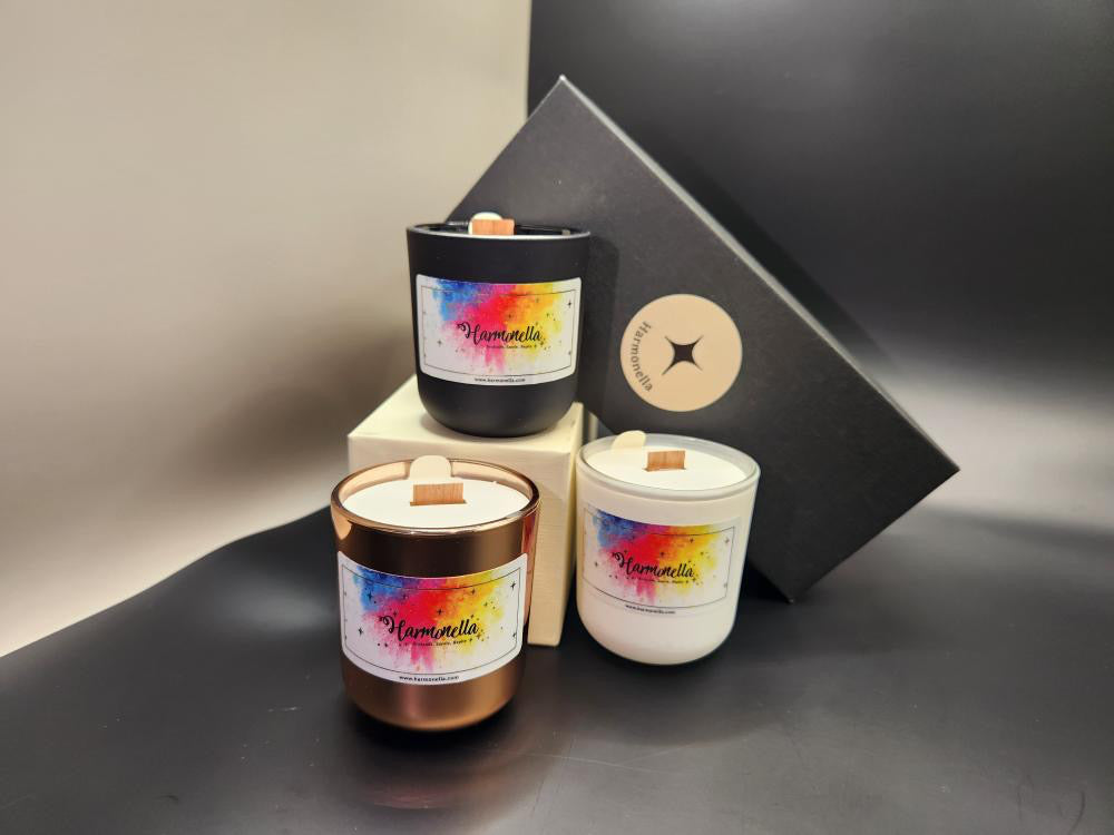 El set de 3 velas aromáticas de Harmonella de 2.7 onzas ofrece sus aromas que representan la Fe, Amabilidad y Entusiasmo.